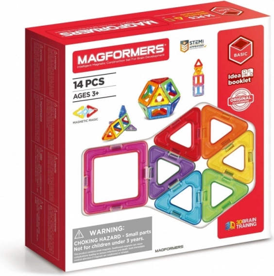 MAGFORMERS BASIC 14 so bloki z vgrajenimi močnimi neodimskimi magneti, ki se med seboj vedno privlačijo. Dovolj je približati stene dveh blokov in takoj se povežejo. Iz kock, oblikovanih po geometrijskih likih, lahko gradite čudovite tridimenzionalne zgradbe. Pri igri lahko uporabite priložena navodila ali druge primere na strani magformersworld.com oziroma svojo domišljijo. Set vsebuje: 8 trikotnikov; 6 kvadratov.