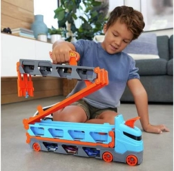 V nekaj trenutkih spremeni kamion v polnokrvno dirkalno stezo. Transporter skrije do 20 avtomobilčkov za prozornimi okenci, zato imaš zbirko vedno na očeh. Ko potegneš za ročaj, se prikolica razpre v dvopasovno stezo dolgo 1,8 m, medtem ko se kabina spremeni v dvojno izstrelitveno postajo za poštene štarte.