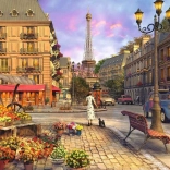 Prizor vključuje živahno uličko atmosfero s cvetličnimi stojnicami in klasično arhitekturo, ki poudarja kompleksnost in živost.