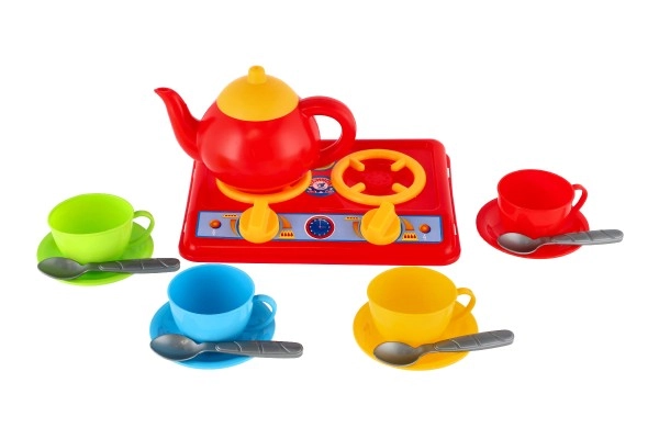 Ta pisani komplet za male kuharje prinaša vse, kar je potrebno za zabavno kuhanje in postrežbo. Kompaktni plastični kuhalnik z upravljalnimi gumbi dopolnjuje rdeč čajnik ter štiri skodelice s krožnički in žličkami – idealno za otroške čajne zabave.