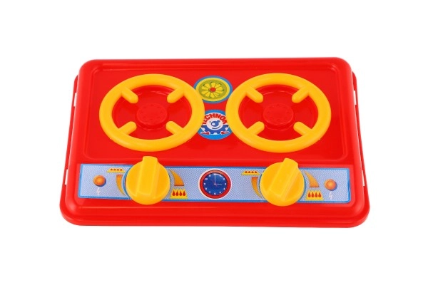 Rdeč kuhalnik z dvema ploščama in vrtljivimi gumbi spodbuja domišljijo ter otroke uči osnov kuhanja pri varni igri.