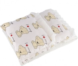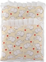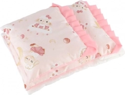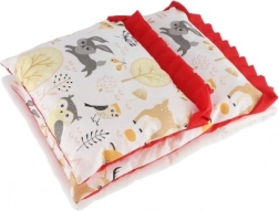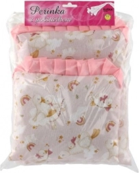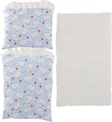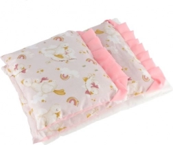 Praktičen komplet za punčke vsebuje vse, kar je potrebno za udoben spanec: mehko odejo, puhasto blazinico in podlogo. Zahvaljujoč nežnim materialom in igrivim motivom se poda v vsak otroški sobici ter spodbuja razvoj domišljije in igro vlog.