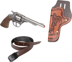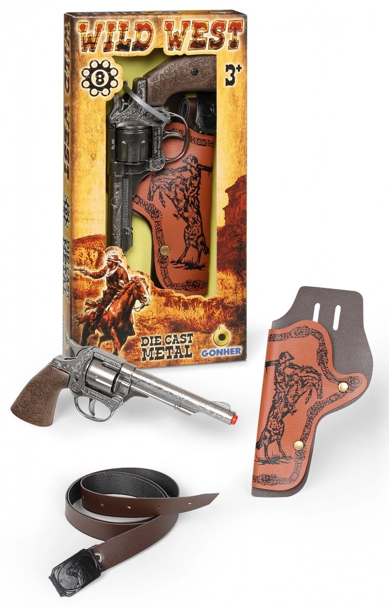 Uživajte v vzdušju Divjega zahoda s kakovostnim kovinskim revolverjem znamke GONHER. Realistična izdelava, prijetna teža in zanesljiv mehanizem za 8 nabojev naredijo to igračo odličen dodatek za igre kavbojev in Indijancev ter stilski kos za zbirko.