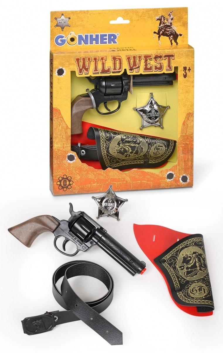 KOMPLET KAVBOJSKEGA REVOLVERJA 202/0 S TOKOM + značkaKomplet vsebuje plastični kavbojski revolver za 8 strelov, tok in šerifovo značko.