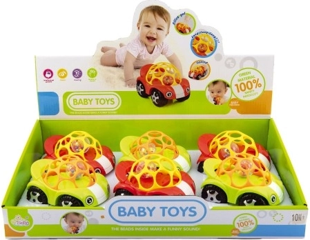 Plastični avtomobilček je zasnovan tako, da pritegne pozornost otrok s svojimi veselimi barvami in ropotajočimi zvoki, ki jih ustvarja kroglica znotraj. Zaradi mehke in luknjaste strehe ga lahko enostavno primejo tudi najmlajši otroci.