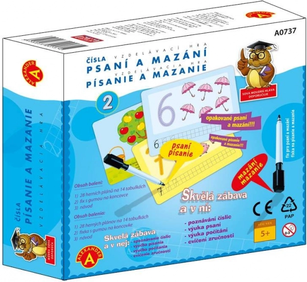Igra Pexi pisanje in brisanje – številke prinaša 14 obojestranskih tablic z 28 učnimi motivi, ki korak za korakom vodijo otroke do samozavestnega pisanja številk 1–14. Prekinjene črte olajšajo vajo oblik, tematske sličice pa pomagajo pri razumevanju količin. Zaradi površine, ki jo je mogoče obrisati, lahko otroci napake zlahka popravijo in naloge izpolnjujejo znova in znova.