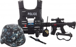 Čelada, očala, radijska postaja, granata in ura ustvarijo popoln policijski komplet. Zahvaljujoč mrežasti embalaži imate vse pregledno na enem mestu.