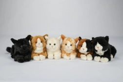 Plišasta mačka velikosti približno 30 × 15 × 13,5 cm (vključno z repom). Starost 0+