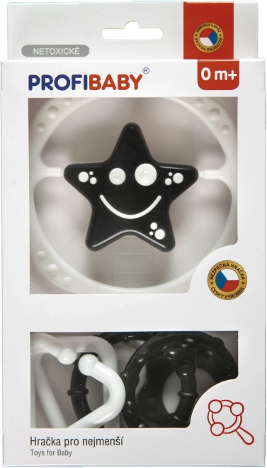 Praktičen črno-bel komplet ropotuljic za dojenčke združuje verižico za voziček in samostojno ropotuljico v obliki zvezdice ali rožice. Kontrastne barve podpirajo vizualno zaznavanje, medtem ko nežen zvok in varne oblike razvijajo otrokovo motoriko in čute. Ropotuljice so zasnovane za udoben oprijem in izpolnjujejo stroge higienske standarde. Brez ostrih robov, brez majhnih snemljivih delov in idealne za vsakodnevno igro doma in na poti.