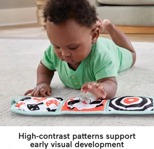Odkrijte svet skupaj z dojenčkom z mehkim zložljivim panelom FISHER‑PRICE Fold & Play. Vsaka od štirih dvostranskih ploskev skriva privlačno aktivnost: ogledalce za spoznavanje sebe, šumeče teksture, premične zavihke, grgranje/ropotanje kroglic in druge tipne dražljaje. Visok kontrast podpira vizualni razvoj novorojenčkov, medtem ko barve in živalice prebujajo naravno radovednost.