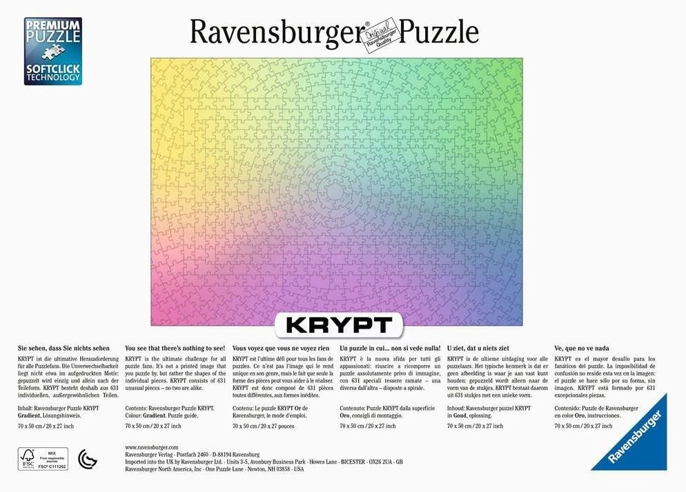 Sestavljanka Ravensburger Krypt Gradient je edinstvena uganka brez klasičnega motiva – namesto slike vas vodi spiralna kompozicija in gladek barvni preliv. Neobičajne oblike kosov prinašajo pameten izziv za posameznike in skupine, idealno za sprostitev in urjenje zbranosti.