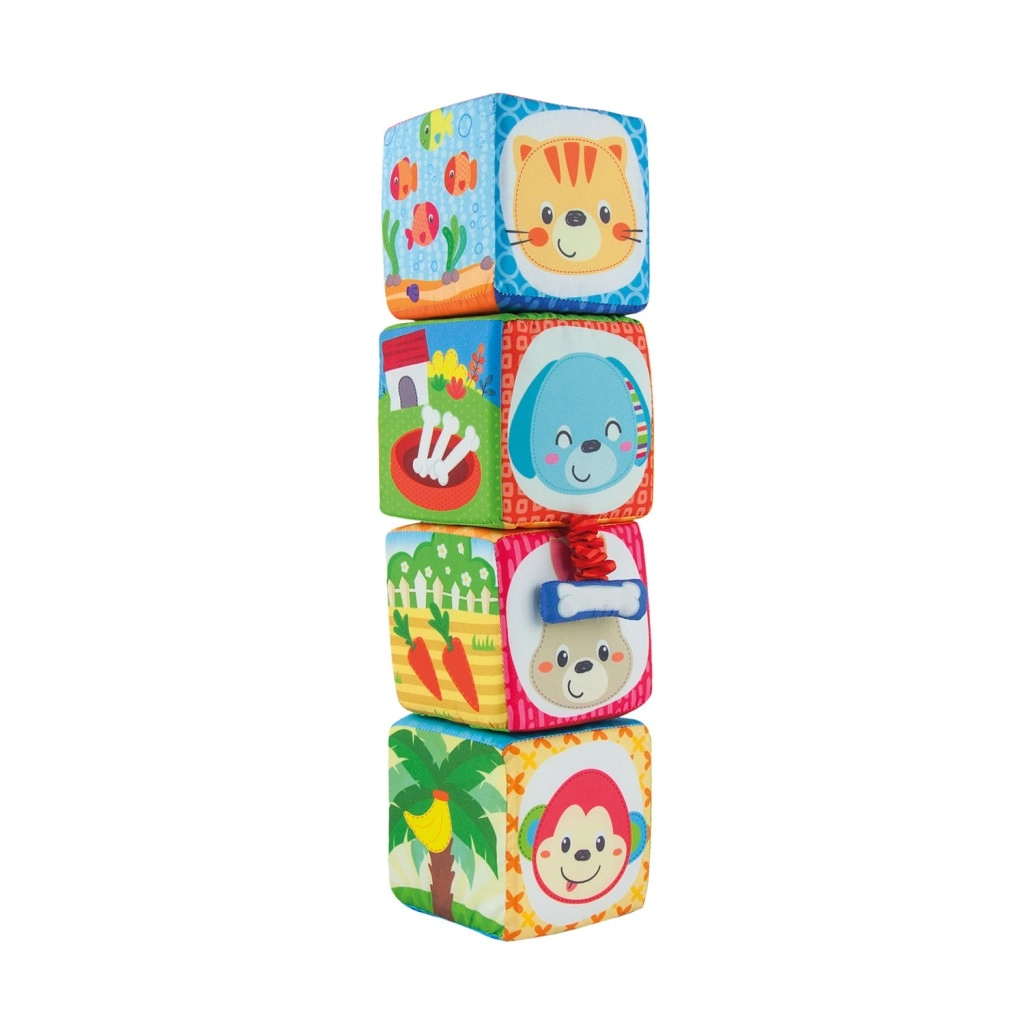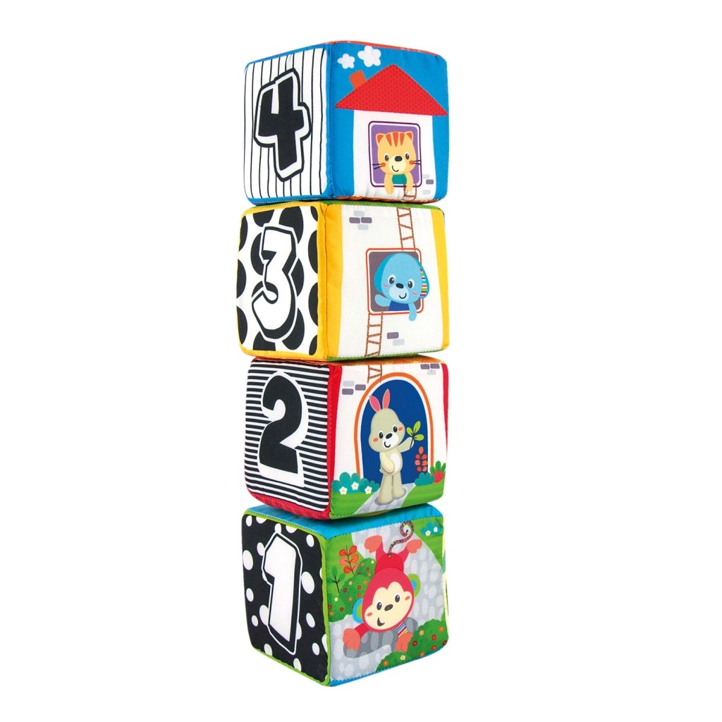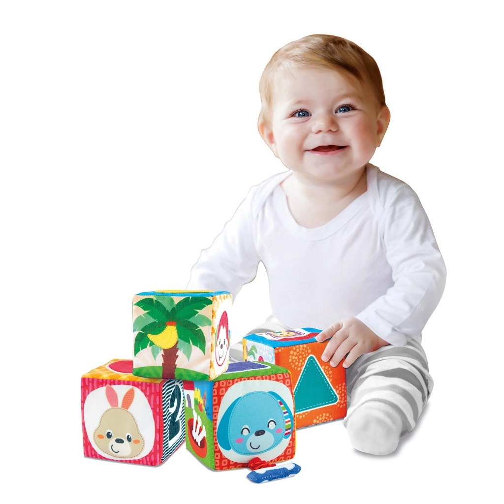 Odkrijte komplet 4 barvitih, tekstilnih kock za dojenčke in malčke, ki razvijajo čutno zaznavanje, fino motoriko in učenje številk in oblik. Vsaka kocka ima različne teksture, varno zrcalce ter ilustracije živalic, številk in oblik. Kocke lahko zlagate v stabilno piramido in iz njih sestavljate slikovne serije za zabavno učenje.