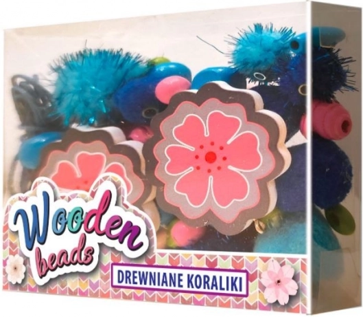 Ustvarite si svoje unikatne lesene nakite s tem kreativnim setom. Vsebuje različne vrste okraskov in dodatkov, ki otrokom in odraslim olajšajo izdelavo zapestnic in ogrlic. Majhne modre lesene kroglice, pisane cofke, leseni obeski v obliki cvetov in voskana vrvica zagotavljajo zabavo in razvoj fine motorike. Idealno za otroke od 4 let dalje.