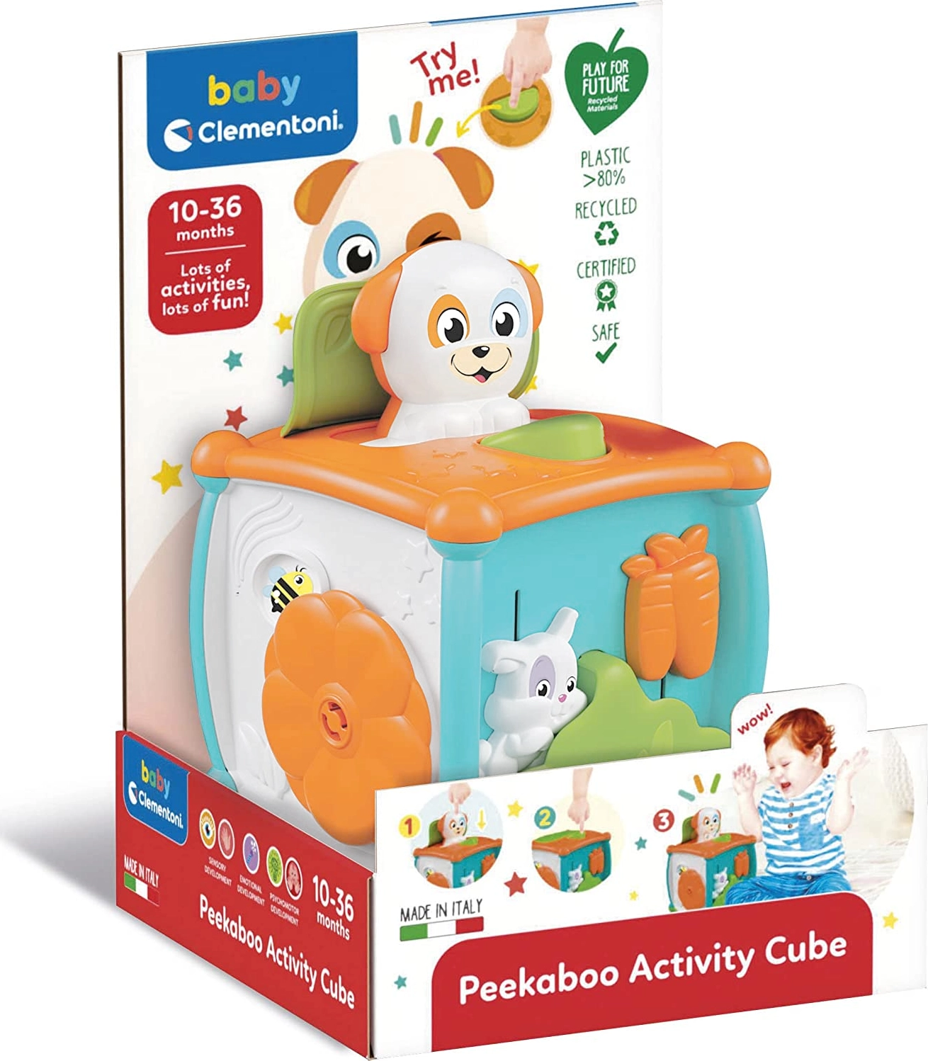 Izdelek je del ekološkega programa Clementoni Play for Future, ki otroke uči pomembnosti trajnosti. Dimenzije kocke so 14 x 14 x 14 cm. Barvna izvedba se lahko razlikuje.