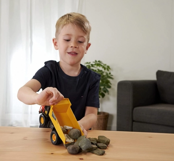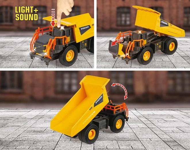 Licenčni VOLVO prekucnik brez motorja s svetlobnimi in zvočnimi funkcijami. Kabina je izdelana iz kovine. Mehke gumijaste pnevmatike zlahka premagajo zahtevne površine na gradbišču. Premišni deli: pokrov motorja in prekucna kesona. Dolžina: 20 cm.