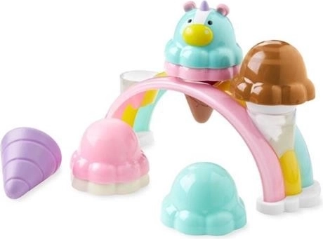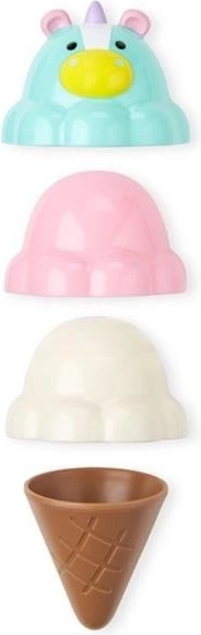 Komplet vsebuje vse za majhno domačo sladoledarnico: 5 barvitih kepic, posebno kepico samoroga, 3 kornete in mavrično stojalo za serviranje. Idealno za samostojno ali skupno igro sorojencev oziroma prijateljev.