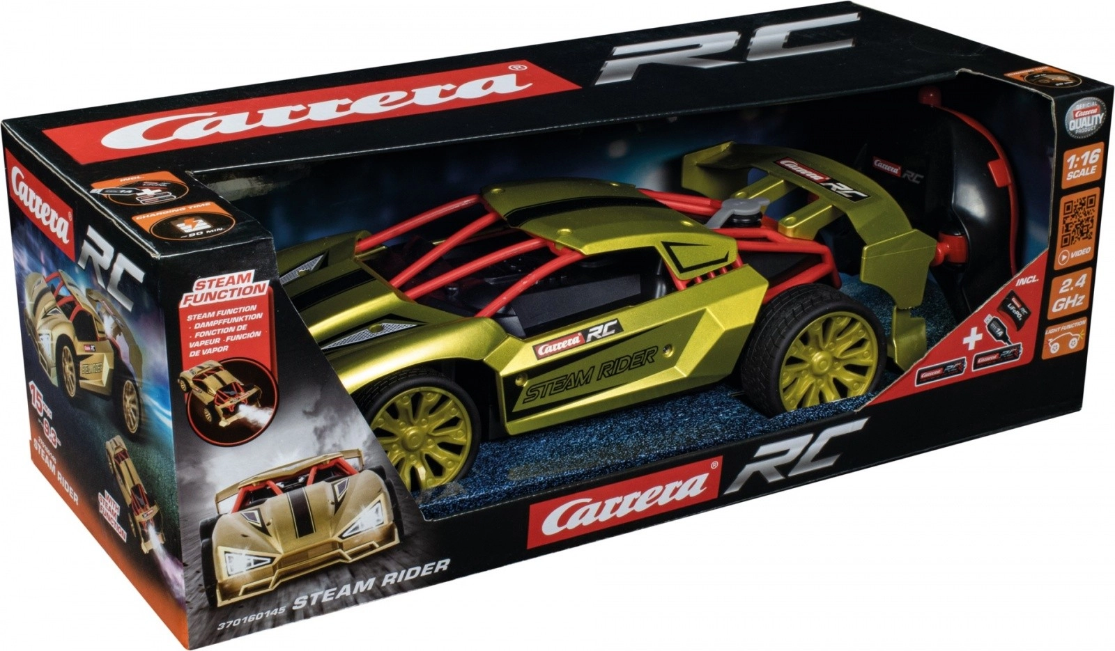 Steam Rider je eleganten RC hitri avtomobil, ki navduši ne le z videzom, temveč tudi z učinki. Dovolj je, da v model dolijete vodo in z enim pritiskom gumba sprožite realističen parni učinek, ki med vožnjo ustvari vtis „kadečih“ pnevmatik. Skupaj z LED lučmi je model opazen podnevi in ponoči.