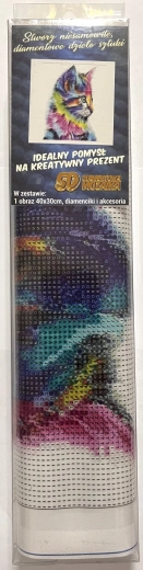 Diamantno slikanje je odličen način za sprostitev in prijetno preživljanje časa samostojno ali z družino. Z aplikacijskim peresom nameščate kamenčke na označena mesta na platnu ter postopoma ustvarite bleščečo mozaik sliko z motivom mavričnega mucka. Ne potrebujete nobenih umetniških spretnosti – dovolj je, da sledite legendi in barvam.