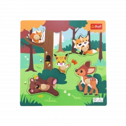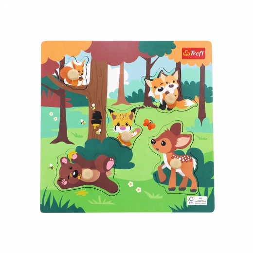 Lesena sestavljanka z barvitimi ilustracijami gozdnih živalic je zasnovana tako, da otroke zabava in hkrati razvija njihove spretnosti. Vsak kos je trpežen, dobro oprijemljiv in opremljen z lesenim gumbkom za enostavno odstranjevanje. Podlaga ima izrezane oblike s črno-belo sliko, ujemajočo s kosom, kar otrokom pomaga pri intuitivnem razporejanju.