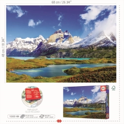 Uživajte v trenutkih miru in tišine s to čudovito sestavljanko, ki vas popelje v dih jemajočo naravo Patagonije. Ta sestavljanka je sestavljena iz 1000 kosov, po sestavi pa doseže velikost približno 68 x 48 cm. Idealen za vse, ki imajo radi izzive in lepe slike na svojih stenah. Zahvaljujoč brezplačno priloženemu lepilu FIX PUZZLE® lahko svoje delo enostavno trajno ohranite.