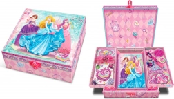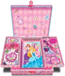 Odkrijte čarobni darilni set v dekorativni škatlici z motivom Princess. Dve stranski polički se zlahka preklopita, pod njima pa se skriva dnevnik za skrivne želje in doživetja. Popolno za shranjevanje drobnarij in vsakodnevno pisanje.
