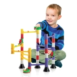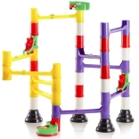 Modularne cevi, stebri in tirnice se natančno prilegajo. Otroci hitro razumejo logiko gradnje in lahko neprestano spreminjajo pot kroglic.