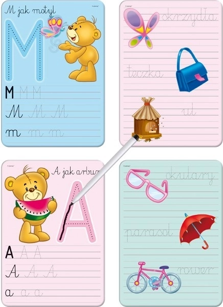 Komplet »Pišem in brišem – črke« motivira male šolarje k vadbi pisanja v varnem in igrivem okolju. Otroci lahko pišejo tudi krivo ali mimo črt – dovolj je, da obrišejo in poskusijo znova. Igrivi spremljevalec, medvedek Krzyś, doda učenju veselje in pogum.
