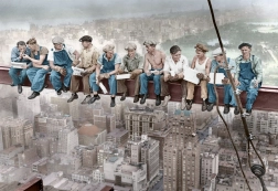 Slavni prizor delavcev na jeklenem nosilcu prinaša pristno vzdušje obdobja gradnje nebotičnikov.