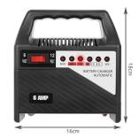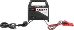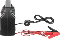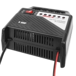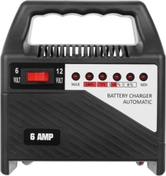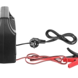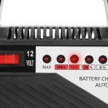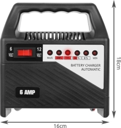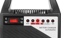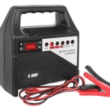 Praktična ročica, kompaktne mere in nizka masa olajšajo shranjevanje in prenašanje. S stikalom izberete pravilno napetost (6 V / 12 V), robustne kleme pa zagotavljajo zanesljiv stik s poli baterije.