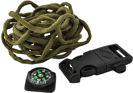 - paracord vrvica, nož, kresilo, kompas, piščalka
