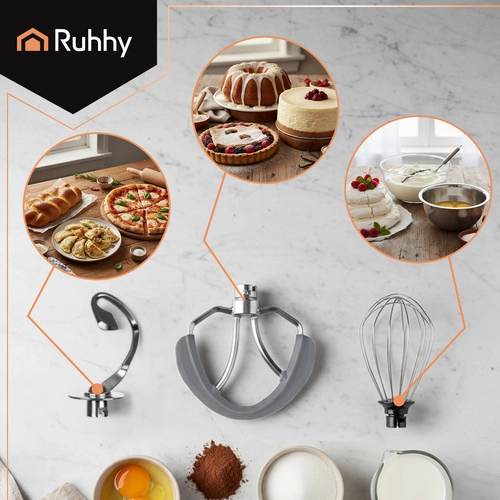 Zmogljiv kuhinjski robot RUHHY s planetarnim mešanjem in prostorno nerjavečo posodo 6,2 l obvlada stepanje, gnetenje in mešanje gostih test in lahkih krem. Zahvaljujoč motorju 1500 W, 6 hitrostim in pulzni funkciji ponuja tekoč nadzor nad pripravo. Stabilna konstrukcija s kovinskim prenosom, LED osvetlitvijo gumba in bogatim priborom olajša vsakodnevno peko in kuhanje.