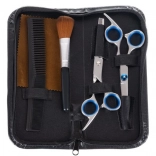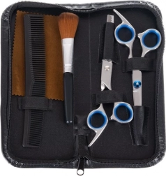 - škarje, degažirne škarje (27 zob), glavnik, čopič, čistilna krpica, frizersko ogrinjalo, etui