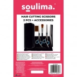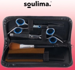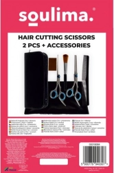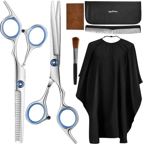 Celovit frizerski komplet za domačo in profesionalno uporabo z 2 pari škarij (klasične in efilirne/degažirne), zaščitnim ogrinjalom, glavnikom, čopičem in etujem z zadrgo. Kakovostne nerjaveče škarje z ergonomskimi oporami za prste in modrimi vložki zagotavljajo natančno striženje in udobje. Vse je pregledno shranjeno za varno skladiščenje in potovanja.
