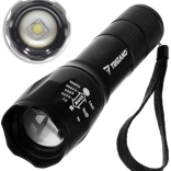 Kompaktna taktična svetilka s čipom CREE LED T6 ponuja močan bel snop, stopenjski (plinuli) zoom in 3 načine svetenja. Odporno ohišje iz aluminija, vodoodporno izvedbo in polnjenje prek USB jo naredijo idealno izbiro za pohodništvo, kampiranje, tek in za nujno uporabo doma.