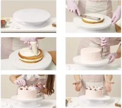 Opremljeno s snemljivo osnovo za enostavno rokovanje, vrteči mehanizem omogoča tekoče vrtenje v obe smeri, kar olajša nanos glazure in drugih dekoracij. Priložene tri dekorativne lopatice imajo različne vzorce, ki omogočajo ustvarjanje edinstvenih in kreativnih površin na vaših tortah.