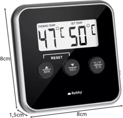 Ko doseže nastavljeno temperaturo, se sproži zvočni alarm. Vgrajen minutnik in magnet na zadnji strani olajšata merjenje časa in pritrditev na kovinske površine.