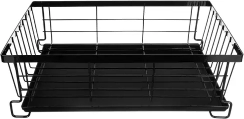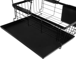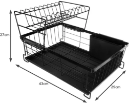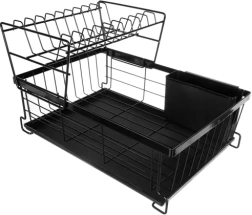 Ta dvonadstropni odcejalnik za posodo učinkovito izkoristi prostor na kuhinjskem pultu: zgornja raven sprejme do 9 krožnikov, spodnja je idealna za sklede, kozarce in skodelice. Konstrukcija iz ogljikovega jekla z obstojno površinsko obdelavo je odporna proti vlagi in vsakodnevni uporabi, medtem ko protizdrsne nogice zagotavljajo stabilnost in varnost tudi pri večji obremenitvi.