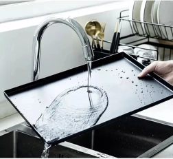 Gladek plastičen pladenj ujame odtekajočo vodo in ohranja kuhinjski pult suh. Po uporabi ga preprosto splaknete pod tekočo vodo – vzdrževanje vzame le trenutek.