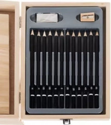 83 skrbno izbranih kosov opreme: akrili, akvareli, barvice, oljni pasteli, 12 grafitnih svinčnikov (H–6B), 10 čopičev, skicirka, paleta, radirka in šilček. Dovolj je, da odprete in ustvarjate.