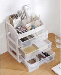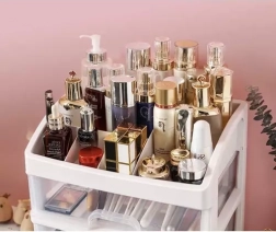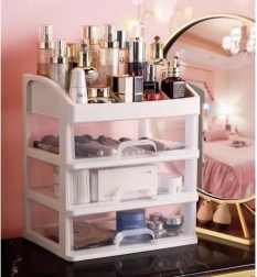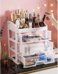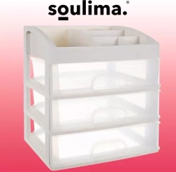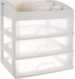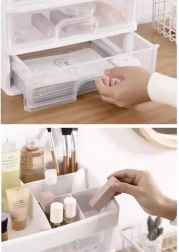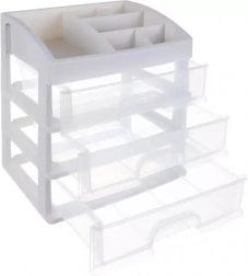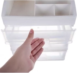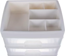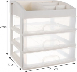 Ta vsestranski organizator združuje pregledno razvrščanje s kompaktno izvedbo. Trije enako veliki prozorni predali so idealni za palete, čopiče, šminke ali nakit, medtem ko zgornji nivo s 6 različnimi predelki sprejme stekleničke, kreme in drobne dodatke. Mlečno bel/prozoren videz se elegantno poda vsakemu interierju.