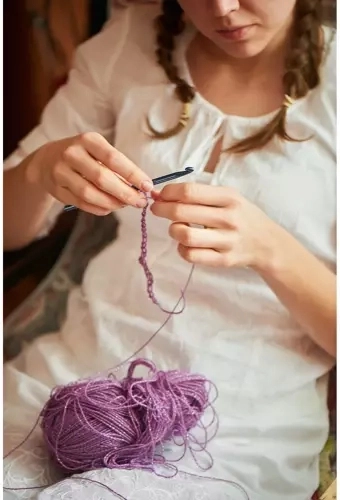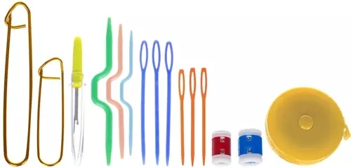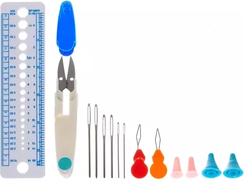 Komplet vključuje ne le kavlje, ampak tudi škarje, ravnila in druge potrebne pripomočke za kvačkanje.