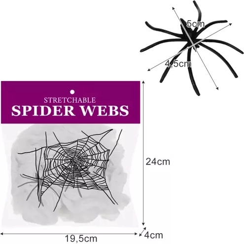 V pakiranju sta 2 črna pajka za še izrazitejši učinek. Dekoracija je primerna za tematske zabave, domačo okrasitev in poslovne dogodke. Namestitev je hitra in preprosta – pajčevino le raztegnete med izbrana mesta in dodate pajka.