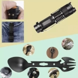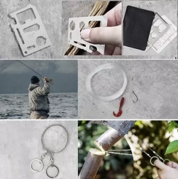 - zložljiv nož z žagico in rezalnikom vrvic, taktično pisalo, kartica za preživetje 11 v 1, kresilo z magnezijevo palčko in praskalom z ravnilom ter odpiračem, svetilka, termo folija 130 × 210 cm, zapirljiv vsebnik, nosilec za steklenico na pas, paracord zapestnica (pribl. 3,5 m vrvice) s kompasom, piščalko in kresilom, silikonske vabe 2 kosa + ribiška vrvica + 2 trnka, jedilno orodje (žlica/vilica z odpiračem + nožek), zložljiva piščalka, vžigalne vrvice 2 kosa, karabina 2 kosa, žična žaga pribl. 60 cm