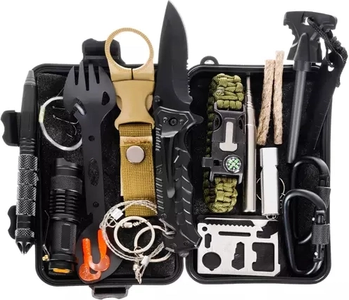 Popoln komplet za preživetje za pohodništvo, kampiranje in nujne situacije v kompaktni, vodotesni škatli. Vsebuje 32 praktičnih orodij, vključno z nožem, svetilko, kresilom, paracord zapestnico s kompasom, kartico za preživetje 11 v 1 in termo folijo. Lahka in enostavno prenosna oprema, ki pomaga zagotoviti toploto, svetlobo, ogenj in osnovno udobje na terenu.