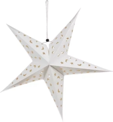 Svetleča papirnata zvezda LED je popoln dodatek za vašo praznično dekoracijo. Ta zvezda je izdelana iz finih papirnih izrezov v obliki zvezdic in lun, ki po prižigu ustvarjajo čarobno svetlobno predstavo na stenah in stropu. Idealna za različne prostore, kot so dnevne sobe, jedilnice, kuhinje ali spalnice.