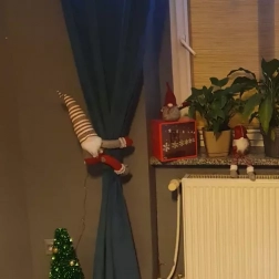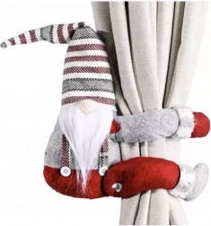 Ustvarite doma prijetno božično vzdušje z dekorativnim škratom, ki ne le krasi, temveč tudi praktično pridržuje zavese. Mehko telo, puhaste brke in pletena kapica pričarajo topel zimski videz, medtem ko sprijemalni trakovi na koncih rok in nog omogočajo, da škrata preprosto pritrdite na tekstil ali ograje.