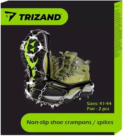 Stabilnost in varnost na spolzki podlagi. Protisnežni nataki TRIZAND s kovinskimi konicami povečajo oprijem na poledenelih pločnikih, tako v mestu kot v naravi. Elastičen rob iz TPE se prilagodi različnim oblikam obutve v razponu velikosti L 41–44 in hkrati trdno drži, ne da bi poškodoval čevlje.