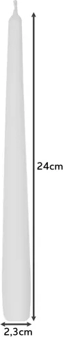Ustvarite prijetno atmosfero z belimi koničnimi svečami, ki odlično dopolnijo slavnostno mizo in notranjo dekoracijo. Zaradi višine 24,5 cm in vitkega premera 2,3 cm delujejo elegantno in se prilegajo večini klasičnih svečnikov.