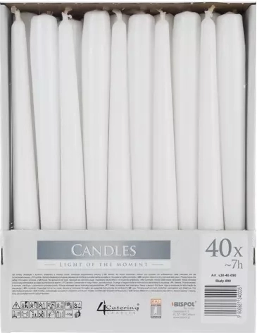 Elegantne bele konične sveče za vsako priložnost. Set vsebuje 40 kosov s premerom 2,3 cm in višino 24,5 cm, primerne za svečnike in laterne. Zahvaljujoč kakovostni parafinski zmesi ponujajo dolgo gorenje do 7 ur, čisto gorenje in brezčasen dekorativni videz za poroke, slavja in domače vzdušje.