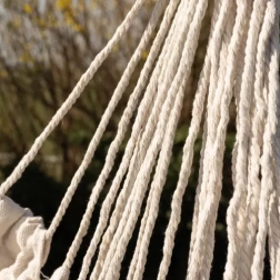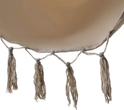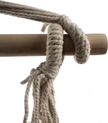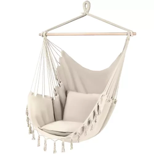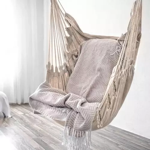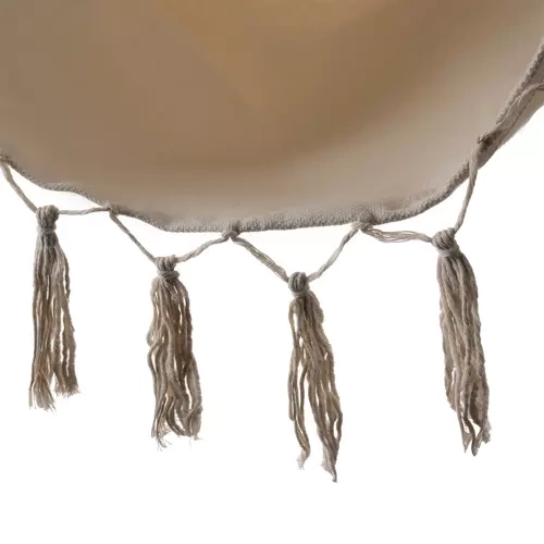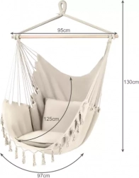 Montaža je enostavna zahvaljujoč močni viseči zanki in trpežnim vrvem, ki enakomerno porazdelijo obremenitev do 120 kg. V paketu najdete tudi 2 blazini (40 × 40 cm) za mehko oporo hrbta in glave. Nevro tralna bež barva se odlično ujema z naravnimi materiali in modernim boho slogom.